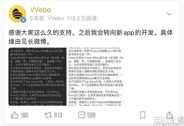 凡是使用过VVebo等第三方微博客户端的朋友,特别是在2017年前的第三方微博客户端,可以说除了比微博自己的APP更好用之外,在功能上几乎一模一样,该有的转评赞、私信、分享、话题等功能都有。从某种意义上来说,在PC互联网向移动互联网转型的那几年里,新浪微博压倒腾讯微博、搜狐微博,也离不开VVebo等更好用的第三方客户端。