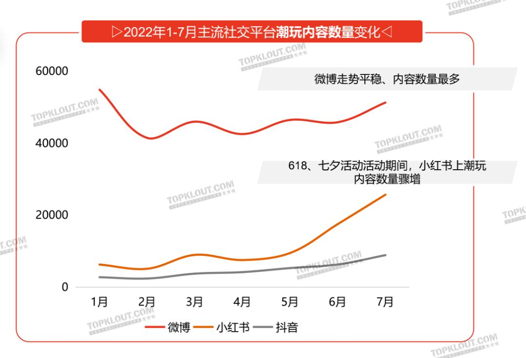 同比2021年,2022年1-8月社交媒体平台潮玩内容规模增长22%,微博、小红书、抖音是内容传播重要阵地。