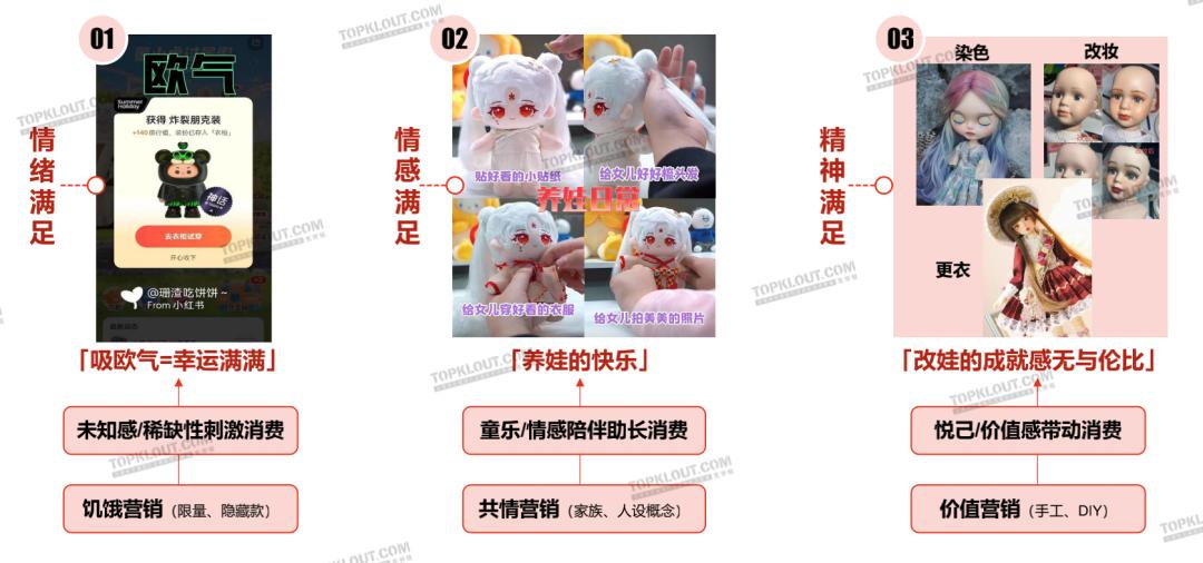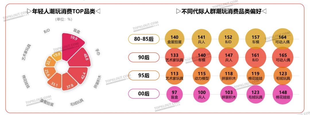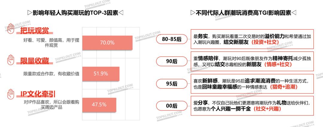 80后更依赖、忠诚于自己关注的达人,信任是他们种草潮流玩具的基础;95后作为网络冲浪满级选手,爱尝鲜、猎奇,潮玩达人、网红大V的推荐都能让他们积极尝试、入坑。