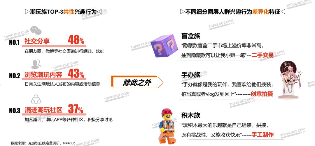 社交分享、刷内容、“混圈子”是潮玩一族的三大共性兴趣行为,除此之外,不同细分圈层人群兴趣行为呈现出差异化特征。