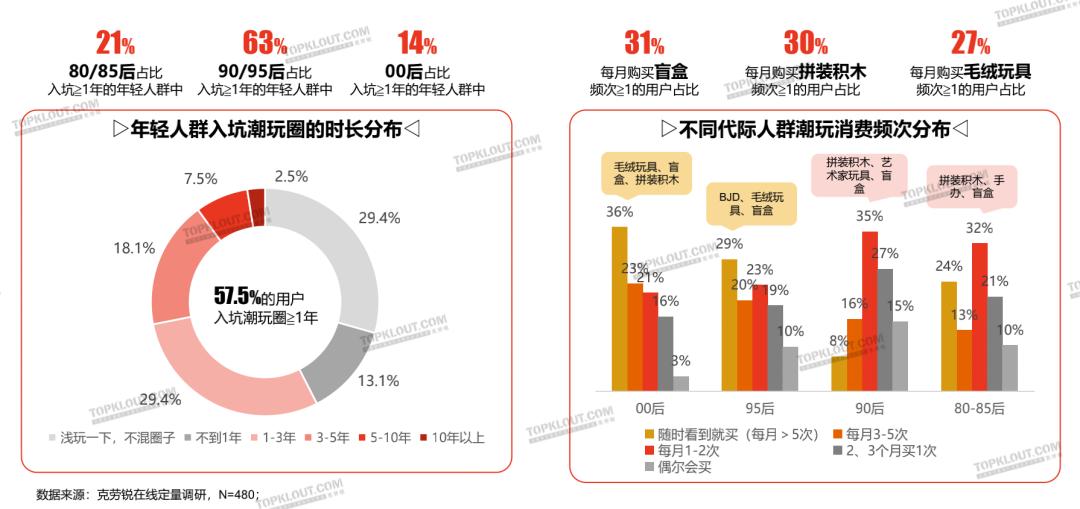 根据克劳锐调研数据显示,58%潮玩人群“入坑”时长超过1年,38%用户每月消费潮玩1次以上。