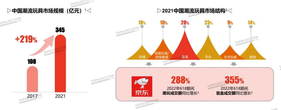 盲盒经济大热带动了中国潮玩市场规模快速增长。2022年618期间京东盲盒成交额同比增长355%。