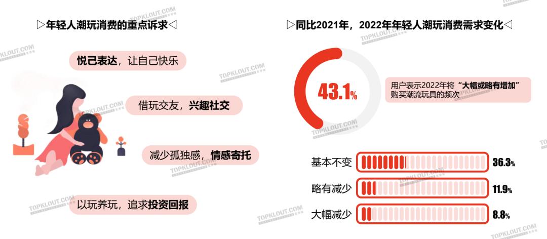 悦己表达、兴趣社交、情感寄托、投资回报等需求驱动年轻人潮玩消费市场扩大,43.1%的调研用户表示2022年将“大幅或略有增加”购买潮流玩具的频次。