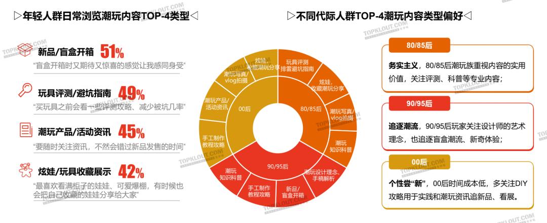 从内容偏好来看,80后与85后潮玩族重视内容的实用价值,关注评测、科普等专业内容;90后和95后玩家关注设计师的艺术理念,也追逐盲盒潮流、新奇体验;00后的时间成本较低,多关注DIY攻略用于实践和潮玩资讯追新品、看展。