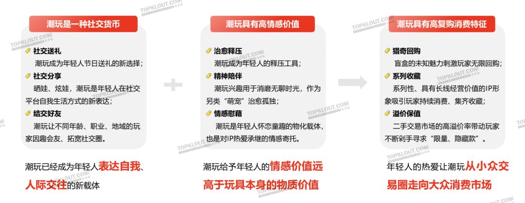 总的来看,潮玩已经成为年轻人表达自我、 人际交往的新载体,潮玩给予年轻人的情感价值远高于玩具本身的物质价值, 高复购带动了潮玩走向大众消费市场。
