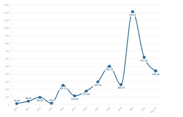 2010-2022 年中国向美国的风险投资估算(百万美元) 来源:FDD