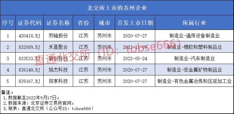 5家苏州企业分别是同享科技(839167.BJ)、旭杰科技(836149.BJ)、苏轴股份(430418.BJ)、禾昌聚合(832089.BJ)、骏创科技(833533.BJ)。