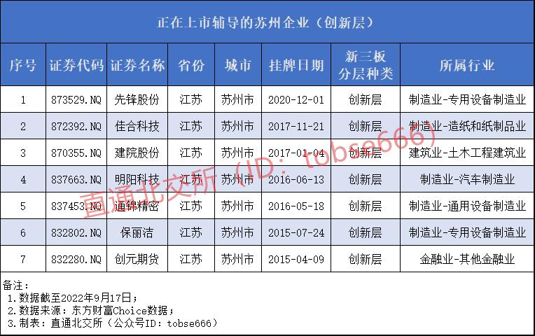 直通北交所(ID:tobse666)根据东财Choice数据进一步统计发现,截至目前,这69家苏州创新层企业中,有7家企业正在上市辅导,其中就有5家企业属于制造业,占比超7成。