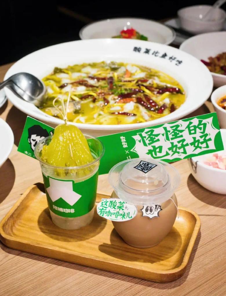 太二酸菜鱼今年8月底宣布,推出一款名为“酸菜咖啡”的全新产品。据了解,这款产品的正式名字叫“原汁酸菜拿铁”,咖啡里真的有酸菜汁,还会附赠一大根酸菜。好在酸菜主义没有贯彻到底,杯中的酸菜不需要食用,只是充当了搅拌的角色。