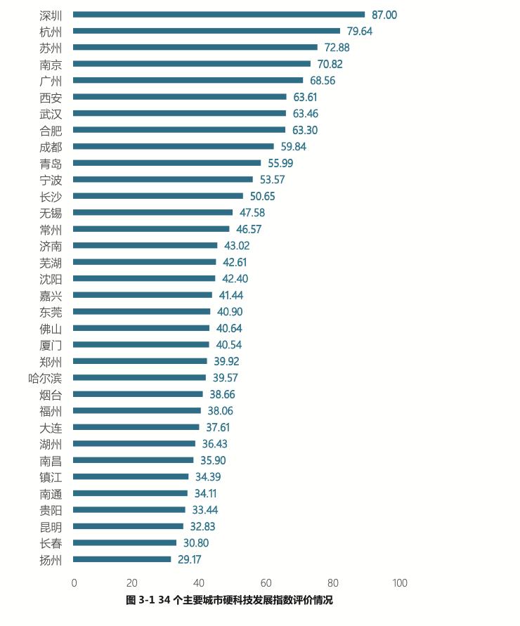 通过对全国34个主要城市的计算评估,《白皮书》发布了城市硬科技发展指数名单。从综合评价结果来看,深圳以较大优势领跑,杭州、苏州、紧随其后,占据前三甲。南京、广州分列第四和第五位,西安以些许优势力压武汉、合肥,排名第六,前十位的城市还有成都和青岛。