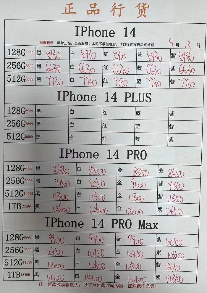 9月19日,界面新闻从多个经销商渠道获悉,iPhone 14因需求不及预期,部分渠道售价已低于官网价格,有的较官网价低1000多元。呼声较高的iPhone 14 Pro/Pro Max机型仍有溢价情况,但比发售前后的价格降温不少。