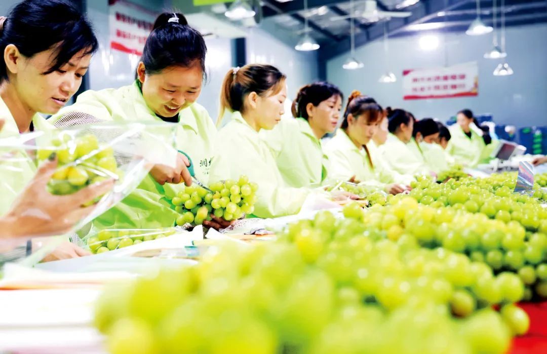 8月26日,安徽淮北濉溪县刘桥镇一家葡萄产业园,工作人员在物流中心冷库内分拣加工刚采摘的精品阳光玫瑰葡萄。图/中新