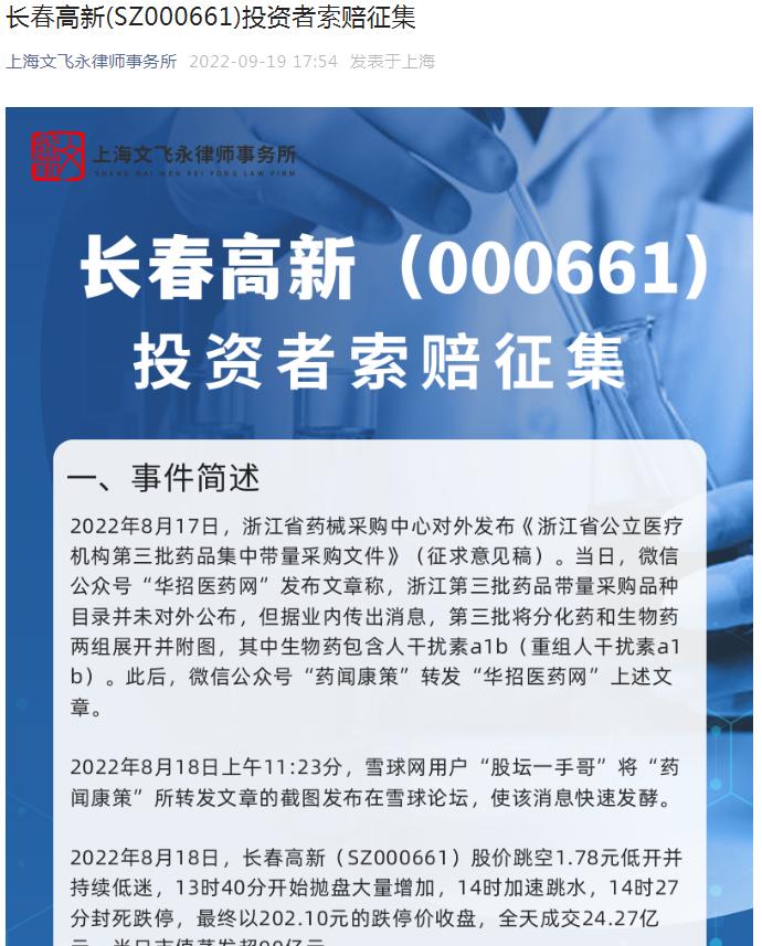 9月19日晚间,上海文飞永律师事务所在公众号和雪球平台发布《长春高新(SZ000661)投资者征集方案》,公开征集符合条件的长春高新投资者向编造、传播虚假信息的行为人进行索赔。