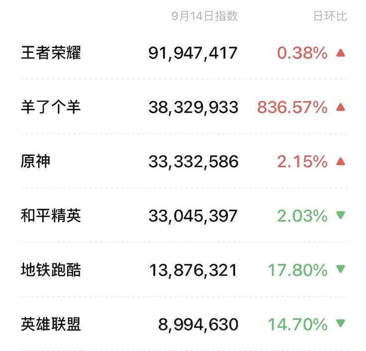 这一天,任天堂直面会公布了《塞尔达传说:旷野之息》续作名称为《塞尔达传说:王国之泪》。 这一天,2022年的第五批版号下发,腾讯子公司和网易都拿到了版号。 同样也是这一天,小游戏《羊了个羊》登上热搜第一,席卷了国内的游戏玩家和从业者,并且在后续一周继续霸榜各种社交平台。 9月14日,《羊了个羊》的微信指数甚至超过了《原神》跟《和平精英》。
