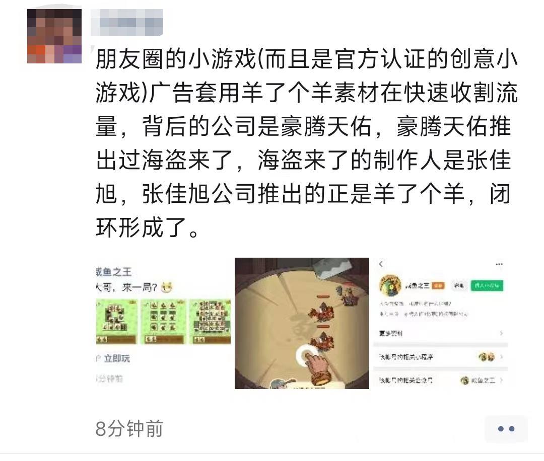 有趣的是,长期占据微信小游戏畅销榜和人气榜的《咸鱼之王》正在用《羊了个羊》的素材在朋友圈收割流量。《咸鱼之王》背后公司是豪腾天佑,而豪腾天佑最成功的游戏就是《海盗来了》,正是《羊了个羊》制作人张佳旭的前一个项目。