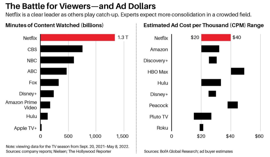 Hulu是销售流媒体广告的老手,CPM估计在20到30美元左右。(迪士尼拥有Hulu三分之二的股份,并可能在2024年从康卡斯特手中收购剩下的股份。)HBO Max是最具CPM吸引力的服务,收费在40美元左右。看跌奈飞的美银分析师纳特·辛德勒(Nat Schindler)预计,奈飞的CPM将在20至40美元之间。在最近的一项分析中,他计算出奈飞每年可能需要38亿美元的广告收入来弥补订阅费的损失,而一开始的广告收入可能不到18亿美元。