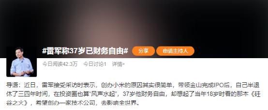 最近,一条有关小米公司创始人雷军的话题 #雷军称37岁已财务自由# 登上了热搜: