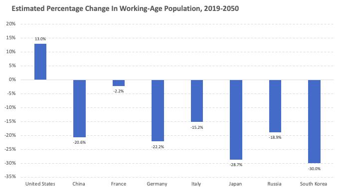 虽然人口结构会延缓美国经济,但对其他国家来说却是五级警钟。因此,即便假设生产率增长水平相同,仅考虑人口结构的话,美国的情况也要比其他发达国家好得多。美国可能会在技术上失分,而中国/欧洲/日本也许所有的行动都走对了,但美国仍可能是一个更大、更强大的经济体。