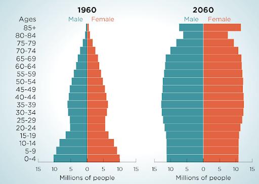 1960 年,0-4 岁的美国人是 70-74 岁的三倍。到 2060 年,这两个群体将几乎持平。