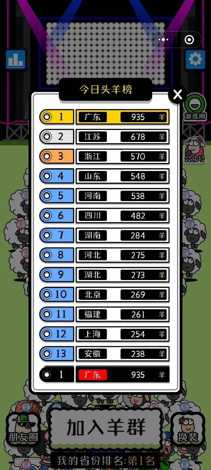 在游戏中,玩家们扮演的是一只羊,一只被牵绊的小羊。这种牵绊来自于游戏内设定的排位制度。平台将同一省份的用户自动归为同一代表队,并以通过当日关卡的小羊数量为依据,为各个代表队进行排名。也就是说,你所在省份通关的用户越多,代表队的排名越靠前。