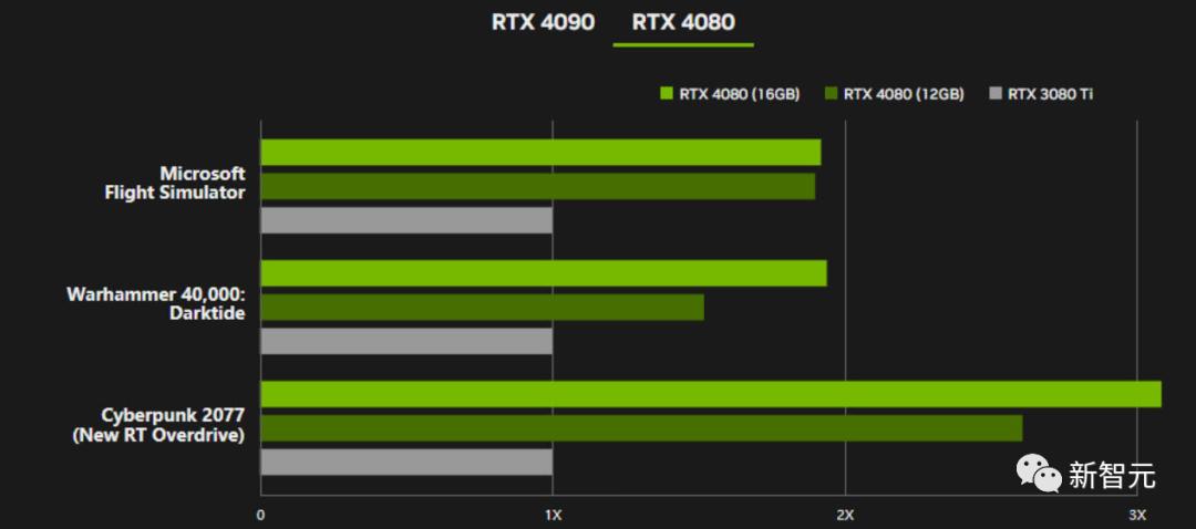 另外,16GB的RTX 4080显卡在现代游戏中的性能比RTX 3080Ti快2(关闭光追)-4(开启光追)倍。