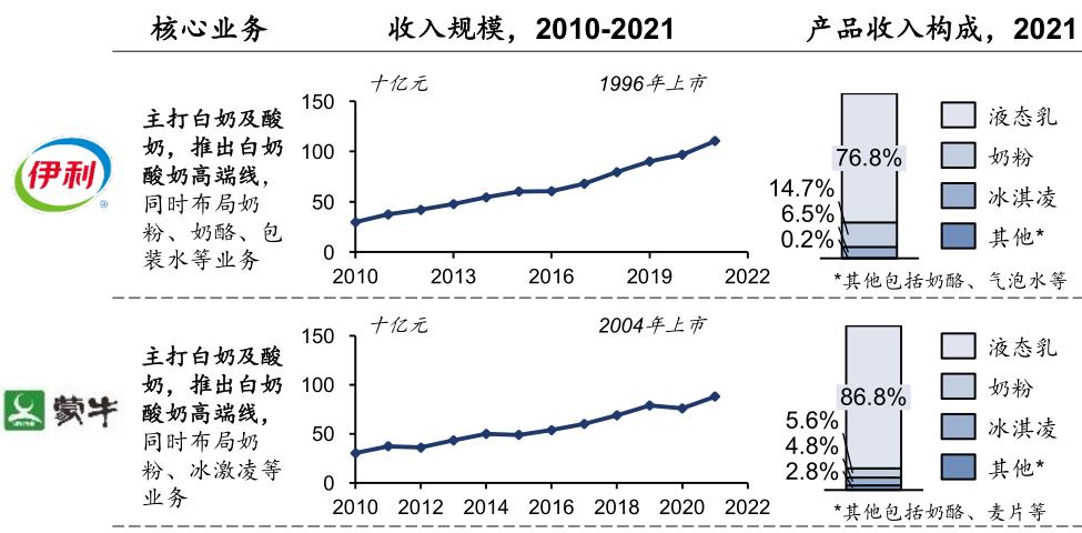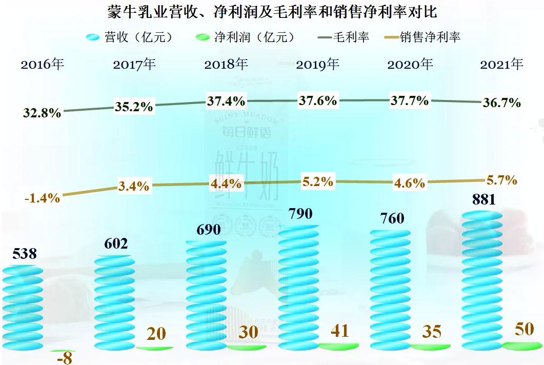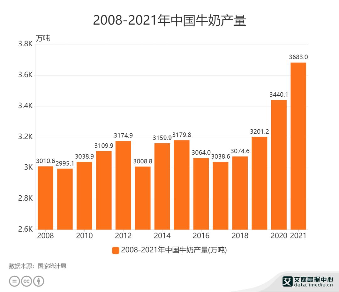 本月初新发布的《中国奶业质量报告(2022)》指出,2021年全国牛奶产量3683万吨,创历史新高;同比增长7.1%,也是过去10年里的第二高增速。规模以上乳品制造企业主营业务收入4687.4亿元,同比增11.7%。行业的稳健发展为领军企业冲刺发力提供了坚实的后备基础。