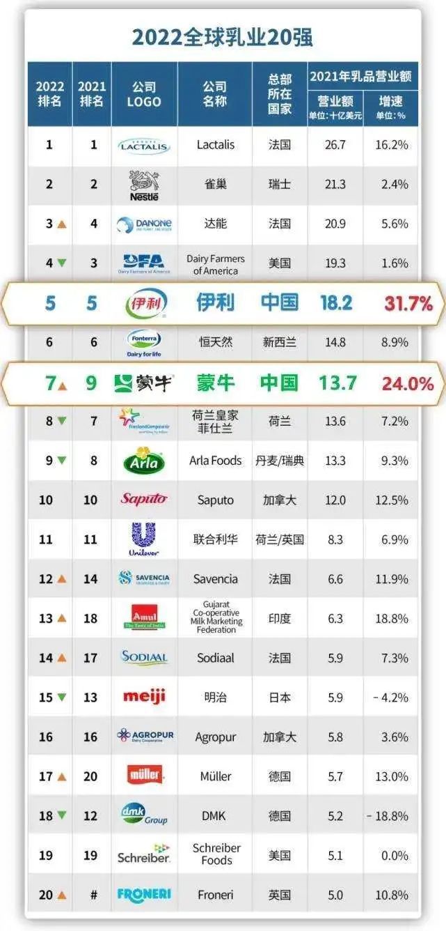 而同样不容小觑的蒙牛,排名创下历史新高,击败了欧洲领先乳企皇家菲仕兰(Friesland Campian)和阿拉食品(Arla),排名提升到第7,沉潜而越,逐步实现2025年“再创一个新蒙牛”的明确目标。