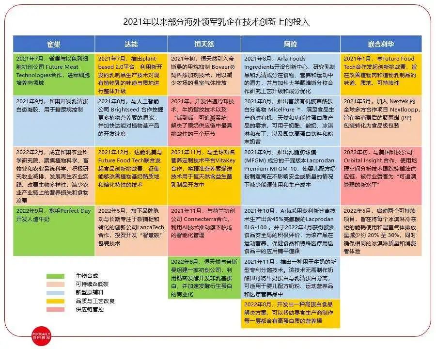 自主技术始终是企业的命脉与创新发展的根基。雀巢、达能等头部乳企在技术上的深厚积累、所涉猎领域的广度与深度,为全球乳业树立起标杆。Foodaily汇总了5家领军乳企自2021年以来在技术创新上的主要投入和成果,发现这些企业的聚焦点不仅囊括新型原辅料开发、产品品质与工艺优化、供应链管理等传统经营环节,也涵盖当下正热的生物合成、可持续&低碳领域。