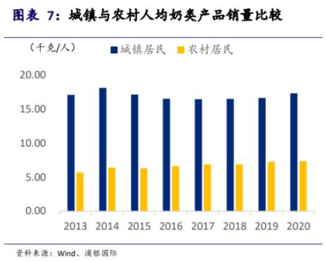 在市场端,中国乳业的短板(也是提升空间)来自人均消费量。中国人均液态奶消费量约为14.2kg,与饮食习惯相近的日韩相比,仅为其 1/2,与欧美国家相比更是有数倍差距。差距主要来自农村,提升农村居民的乳制品消费量将是乳品市场扩容的主要驱动力。