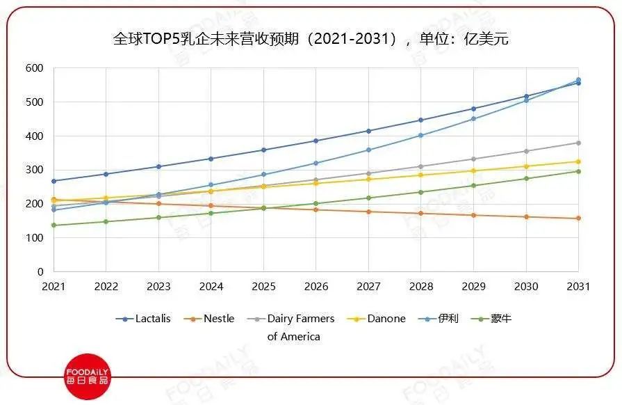根据每家乳企的年均增速预期值作图后,可以清楚地看出:2031年,伊利将以微弱优势超越lactalis成功登顶。