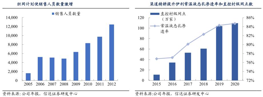 伊利从 2006 年开始布局“织网计划”,通过五年时间,结合奶源及产能扩张,形成了“纵贯南北、辐射东西”的全国性市场布局,成为第一家覆盖全国市场的乳品企业。2013年,公司再次夯实下线渠道,启动渠道精耕计划,重点提升下线市场的渗透率。受惠于“织网计划”,至2020年末,伊利在全国范围内拥有1.5万个经销商,直控村级网点数量达109.6万家。常温液态奶市场渗透率达 84.7%。