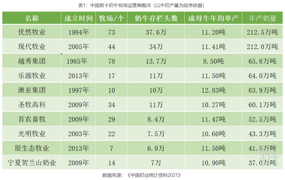 在两大乳企的引领下,国内十大牧场前两名的优然牧业和现代牧业一路走强,两家奶牛存栏量合计近72万头,年产奶量424.5万吨,占据TOP10半壁江山,且有进一步扩大之势。奶源整合为伊利蒙牛的未来发展提供了十足底气。