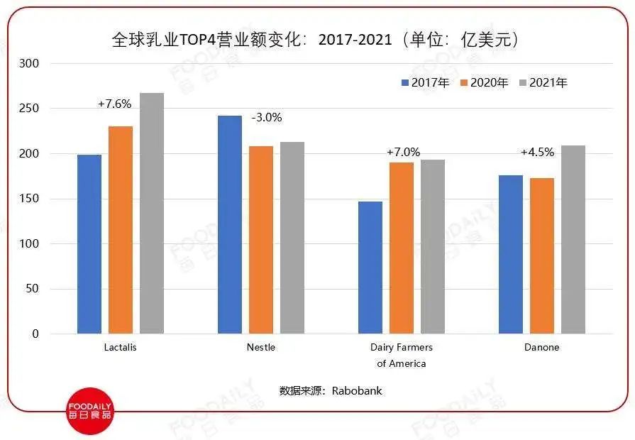 将Lactalis、雀巢、达能和Dairy Farmers ofAmerica这四家头部乳企过去5年的营收情况作图,可以看出:Lactalis和Dairy Farmers ofAmerica表现较好,保持7%以上的年均增速;达能以4.5%位居第三,而雀巢2021年的数字尽管较上年有所“回暖”,但与2017年相比仍属于负增长。