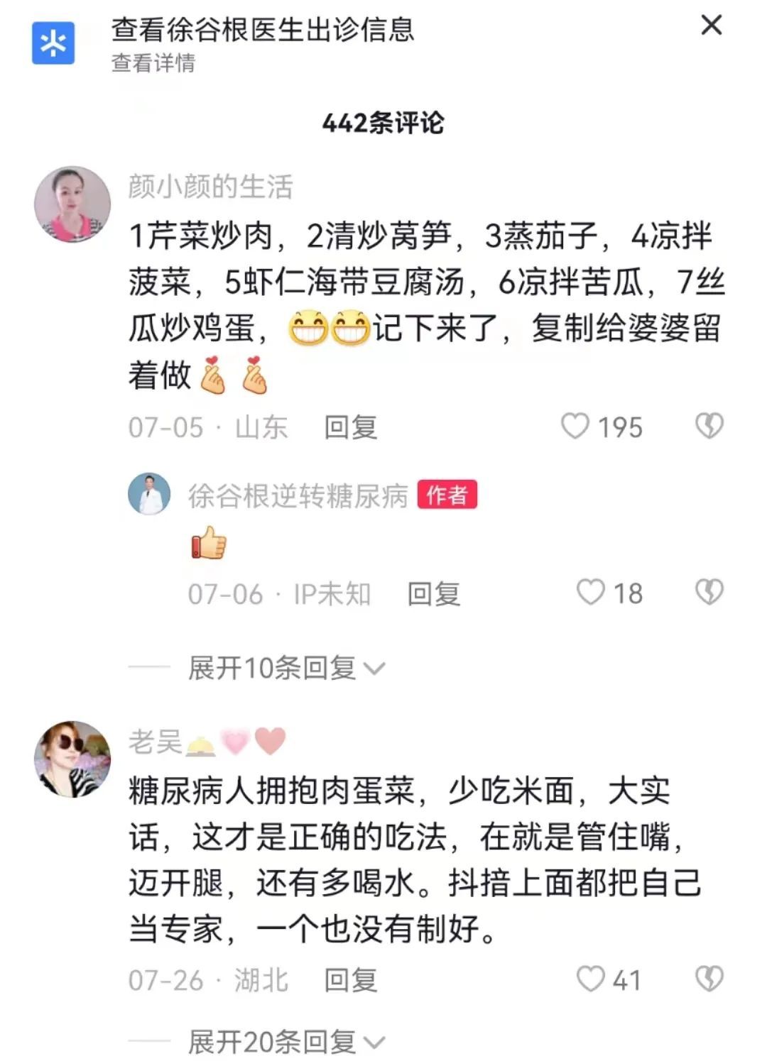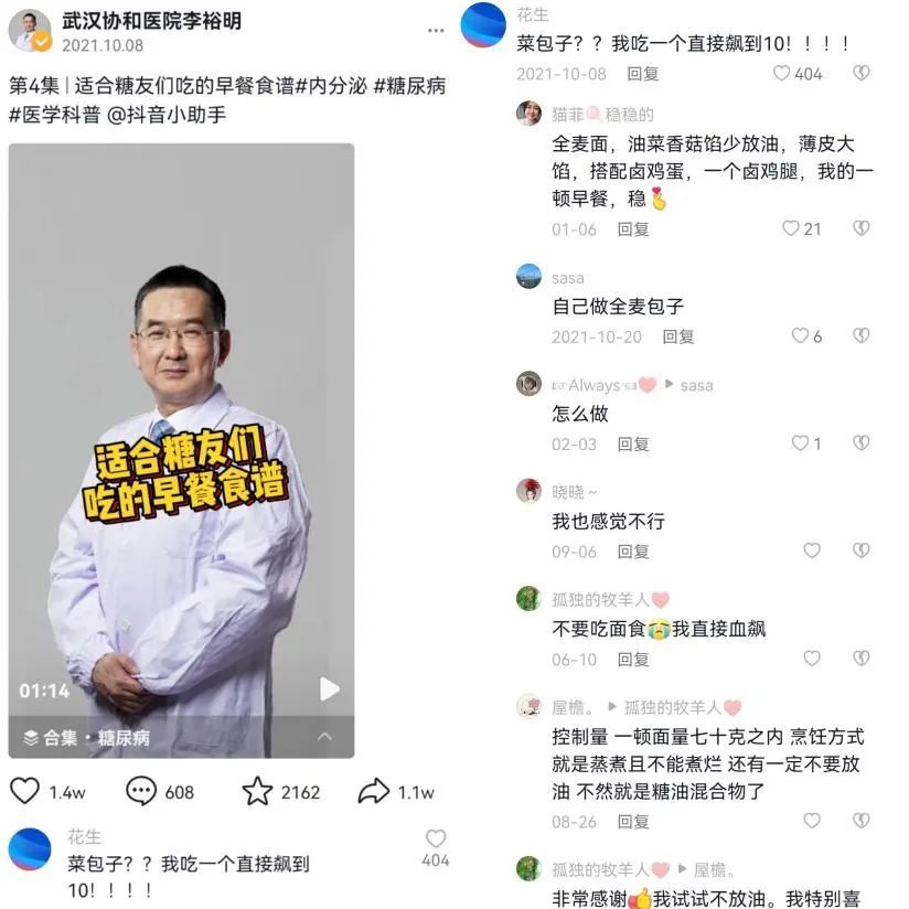 以糖尿病食谱为例,有医生在三餐食谱中推荐菜包子,评论区称“吃一个血糖直接飙到10了”,质疑食谱的适用性。其他人回复中提到,对于血糖较为稳定老糖友来说,控制量、不放油、用全麦面粉自己做也不会升糖太多。