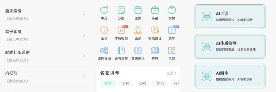 “知源中医”根据AI舌诊、面诊功能,为用户提供病症分析和食疗调理建议。开通会员可以享受专家授课等知识付费服务,但在食谱方案上较为简易。如舌诊只提供了芡实薏苡仁粥的做法和建议食用的食材。
