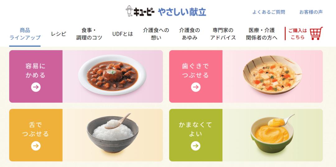 例如日本丘比的やさしい献立(温和菜谱)系列产品,根据老人的咀嚼和吞咽能力将食物硬度分为四个等级,开发搭配好的预制食品。