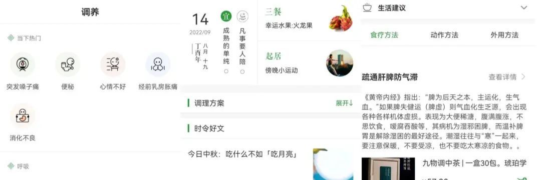 官方会根据季节变换给出食材搭配建议,通过大数据推送调养妙方,对于养生入门人士较为友好。