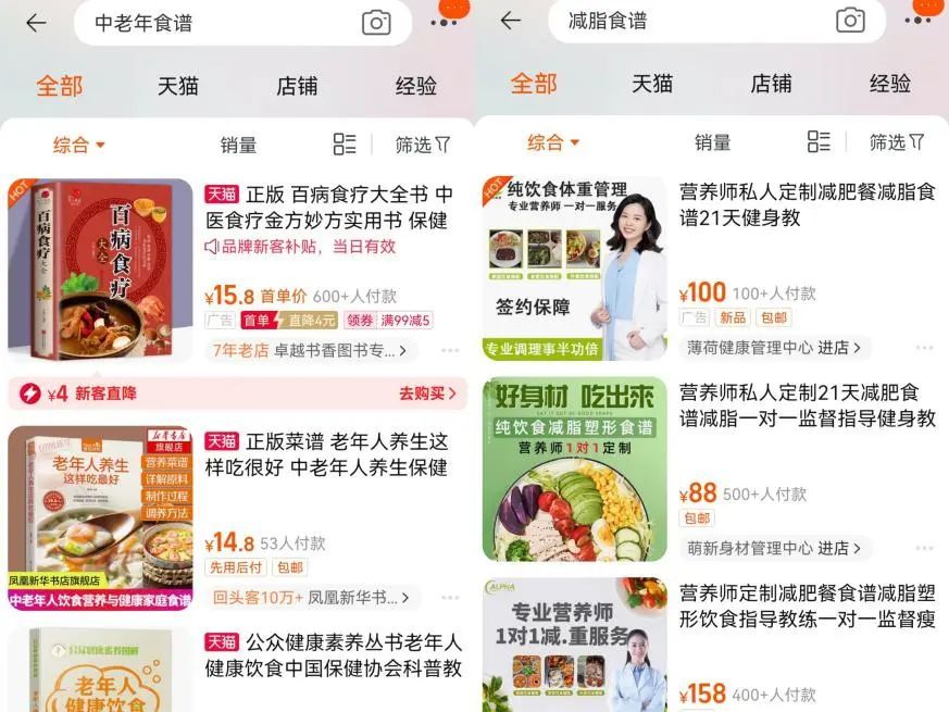 淘宝页面搜索“中老年食谱”和“减脂食谱”分别呈现的商品