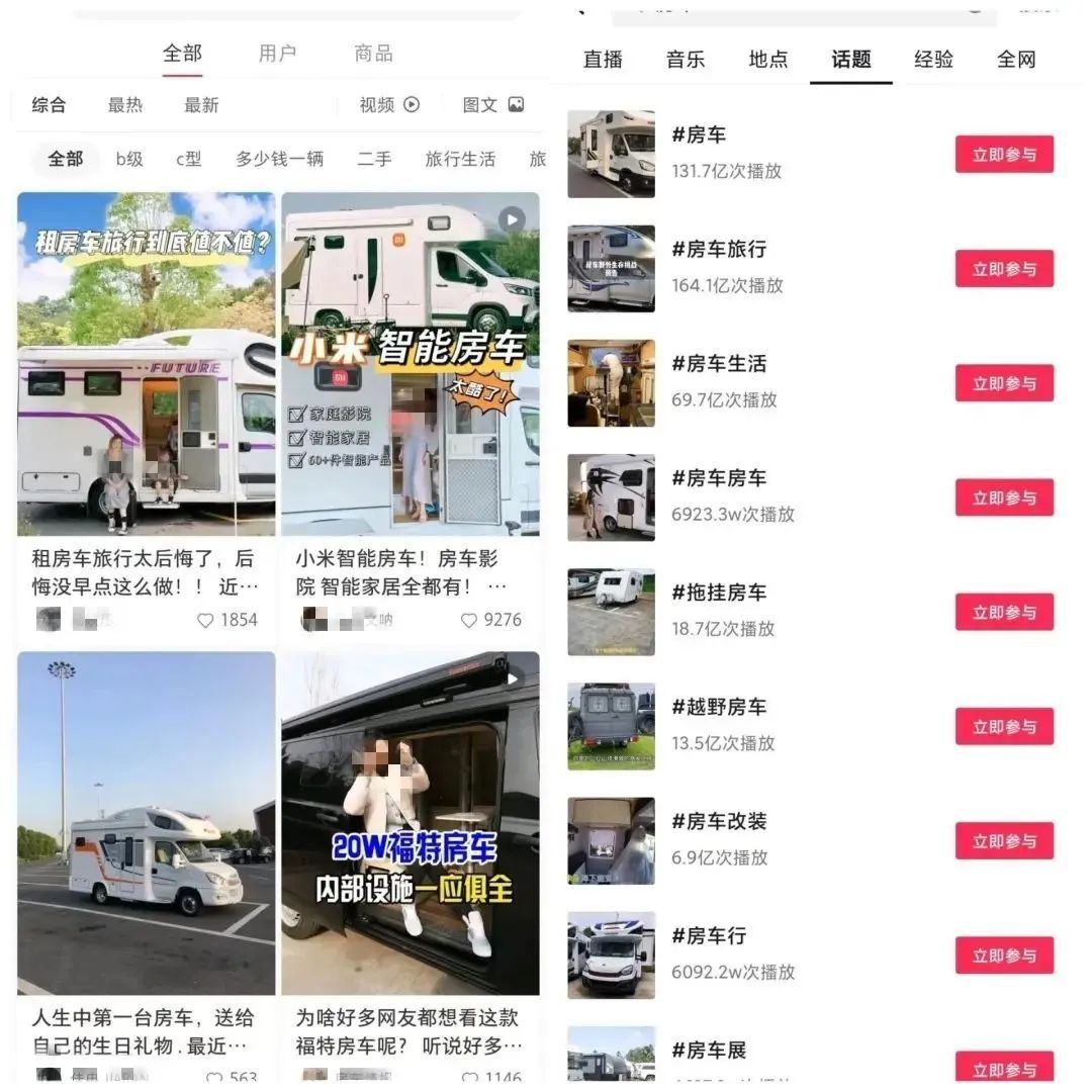 来源/燃次元截图图/小红书房车相关笔记、抖音房车相关话题播放量(左、右)