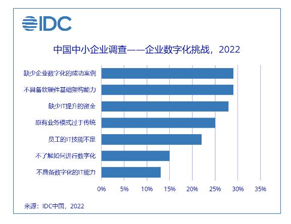 根据IDC的调查,约三分之二的中小企业认为数字化对公司非常/比较重要,但在实际数字化过程中遇到了诸如缺少成功案例、不具备IT基础架构能力、缺少IT提升的资金等挑战。与大企业相比,中小企业在数字化转型的过程中普遍存在数字化基础薄弱、缺钱、缺人又缺技术的难题,导致很多中小企业依然处于彷徨之中,对转型持观望态度,“不敢转、不愿转、不会转” 是目前中小企业的普遍状态。