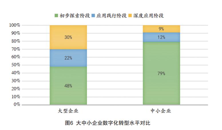 中国电子技术标准化研究院发布的《中小企业数字化转型分析报告(2021)》中数据显示,2021年,79%的中小企业处于数字化转型初级阶段,而超过半数的大型企业已经步入到了应用践行和深度应用阶段。