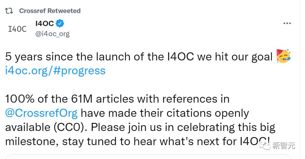 8月18日,Crossref在Twitter上宣布的这一里程碑,是2017年发起的开放引用倡议(Initiative for Open Citations,I4OC)5年来努力的结果。