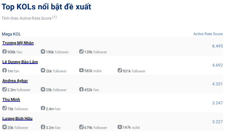 根据Influencer Marketing Hub的一项研究,Z世代和千禧一代更有可能受到KOL的影响,尤其是84%的千禧一代表示,KOL的内容决定了他们如何花钱。今年8月,社交媒体平台上,讨论度高的KOL包括:Trương Mỹ Nhân, Lê Dương Bảo Lâm, Andrea Aybar, Thu Minh, Lương Bích Hữu……