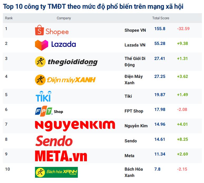 在根据测量指标排名前10个网站中,Shopee VN继续名列前10,8 月访问量高达 1.086 亿,是Thế giới di động的 1.7 倍。排名第三的是FPT Shop,点击量为3790万次。