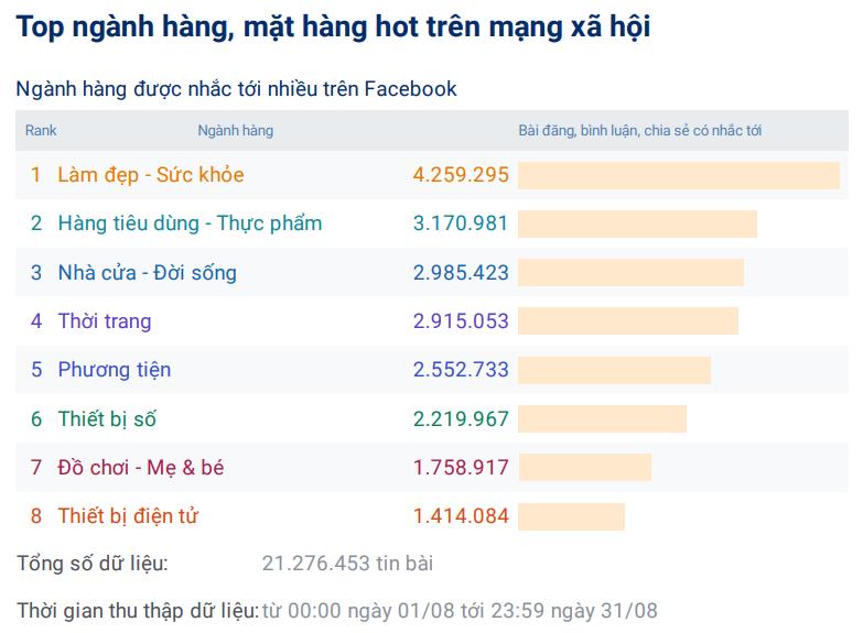 越南电子商务市场在疫情后变得越来越繁荣,预计到2025年将达到390亿美元。在8月里,美容、健康、消费品和食品等行业在社交媒体上最受关注和讨论。此外,最常被提及的商品是冰箱,其次是蛋糕、洗衣机、摩托车、奶茶、笔记本电脑……根据信誉分析。