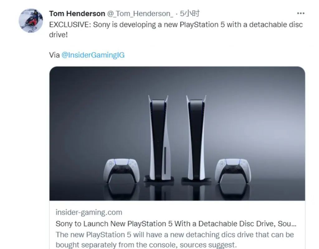 9 月 20 日,曾准确爆料了索尼DualSense Edge手柄的泄密人Tom Henderson在 Twitter 上发布消息称,索尼正在开发带有可拆卸光驱的全新 轻薄款PlayStation 5 游戏机。