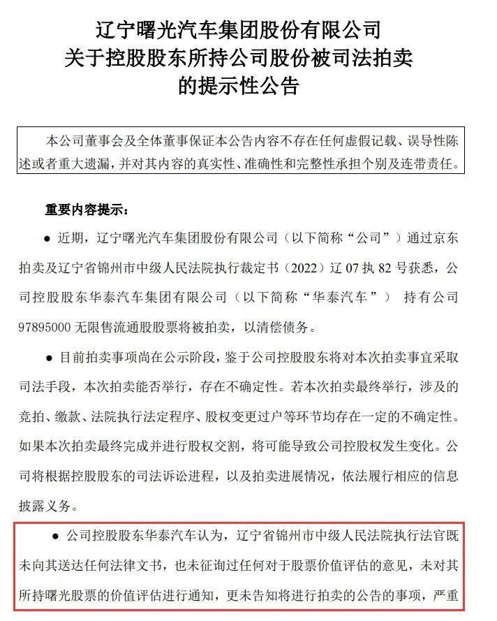 值得一提的是,对于此次股权被司法拍卖,华泰汽车方面并不认可。在前述ST曙光9月4日发布的公告中,华泰汽车认为,自身合法权利被侵犯,正当权益被损害,其将启动相关法律程序,维护自身的合法权益。