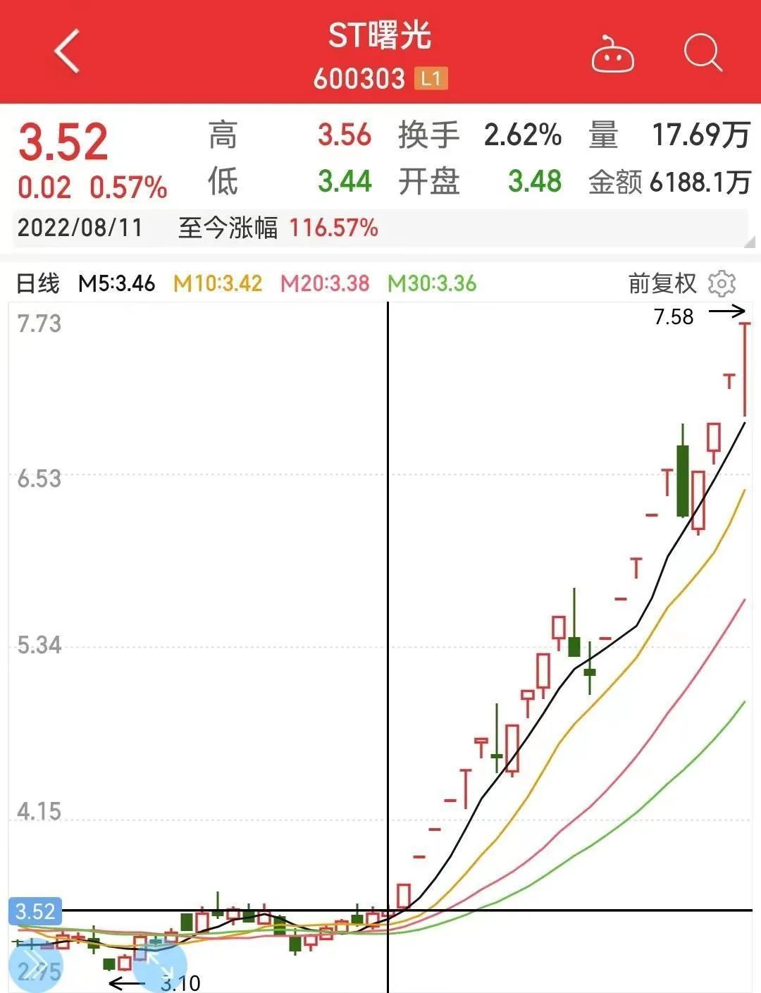 据统计,在23个交易日里,ST曙光收获了19个涨停板,股价更是从8月11日的3.52元/股上涨至9月14日的7.58元,涨幅达115.34%。