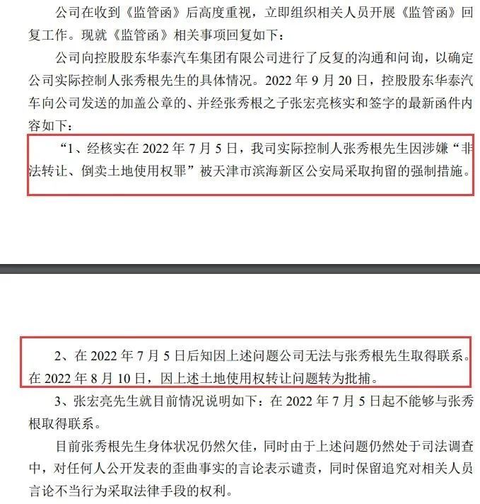 对于这一问询,华泰汽车方面回复称,公司经过自查核实,不存在张秀根董事长失联相关信息泄露的情形。