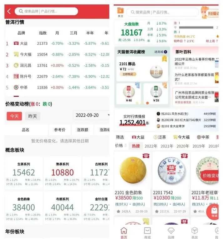 虽然不是股市,但普洱茶的二级交易市场形成了连贯的运作模式,参与者包括发行方(厂家)、投资者、经纪人、经销商等,“涨跌幅、K线、大盘指数、多空对决、单边下跌”等股票交易用词也是普洱茶行情交流话术。普洱茶主要的交易/交流平台有找找茶(APP)、大益行情网、东和茶叶网等,运营公司注册地址多在广州。